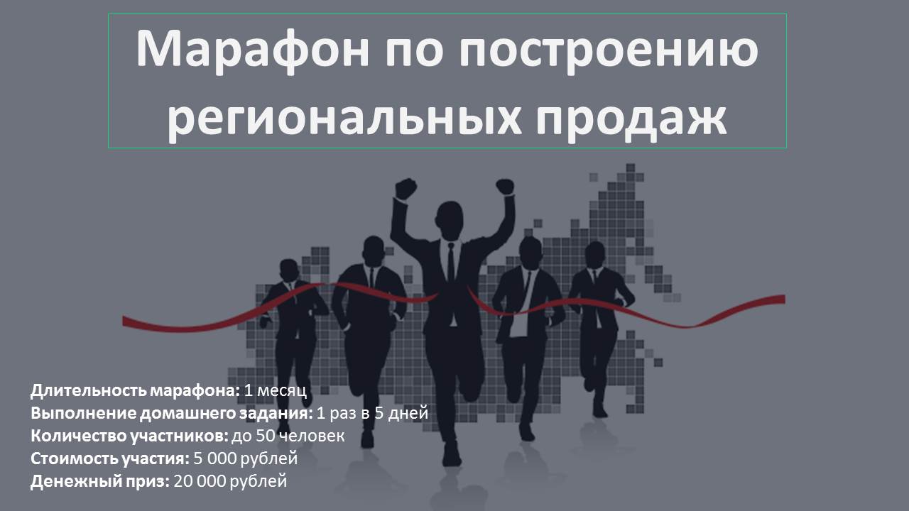 ВНИМАНИЕ!!! МАРАФОН ПО ПОСТРОЕНИЮ РЕГИОНАЛЬНЫХ ПРОДАЖ! -------------------------------------------------------… Читать дальше45;-------------------------------------- Цель: Без рисков организовать сбыт в новом регионе без дополнительных затрат. Пошаговая инструкция по построению региональных продаж за 1 месяц. Совместно с автором проекта Вы выстроите региональные продажи, а также научитесь: - анализировать регион - снижать риски с помощью максимального сбора информации - Практически использовать методику анализа рынка - Видеть востребованные рынком продукты - правильно рассчитывать сделку на предварительных переговорах - повышать рентабельность сделки - оплачивать работу сотрудников только за результат работы - снижать риски для компании и формировать сильную Команду ----------------------------------------------------------------------------------------------- Оставляйте заявки на участие на почту info@tehnology-sbit.ru