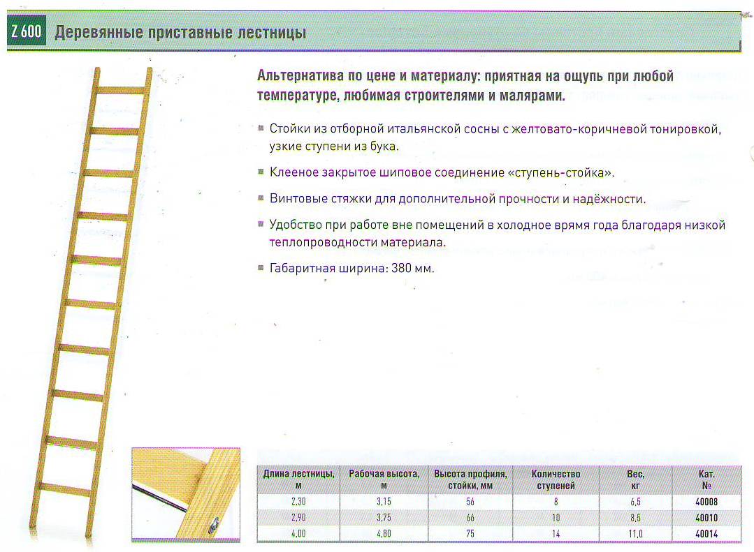 Лестница деревянная приставная (Германия) Длина лестницы до 4м. Для любителей классики – альтернатива по материалу и цене. Стойки из высококачественной отборной древесины хвойных пород желтокоричневого цвета, узкие ступени из бука. Клееное закрытое шиповое соединение “ступень-стойка”. Винтовые стяжки для дополнит… Читать дальшеельной прочности и надежности. Низкая теплопроводность обеспечивает комфорт при работе в зимнее время. Внешняя ширина: 380 мм. Наше качество – Ваша безопасность Полный каталог продукции Царгес на: http://zarges-all.ru/order Россия, 620042, Екатеринбург, ул. Ломоносова, д. 55Б, офис 14, тел./факс: (343) 382-69-10, 381-59-97 www.kaiman.ru, www.zarges-all.ru, www.zarges.com/ru - сайт производителя. E-mail: ural@kaiman.ru